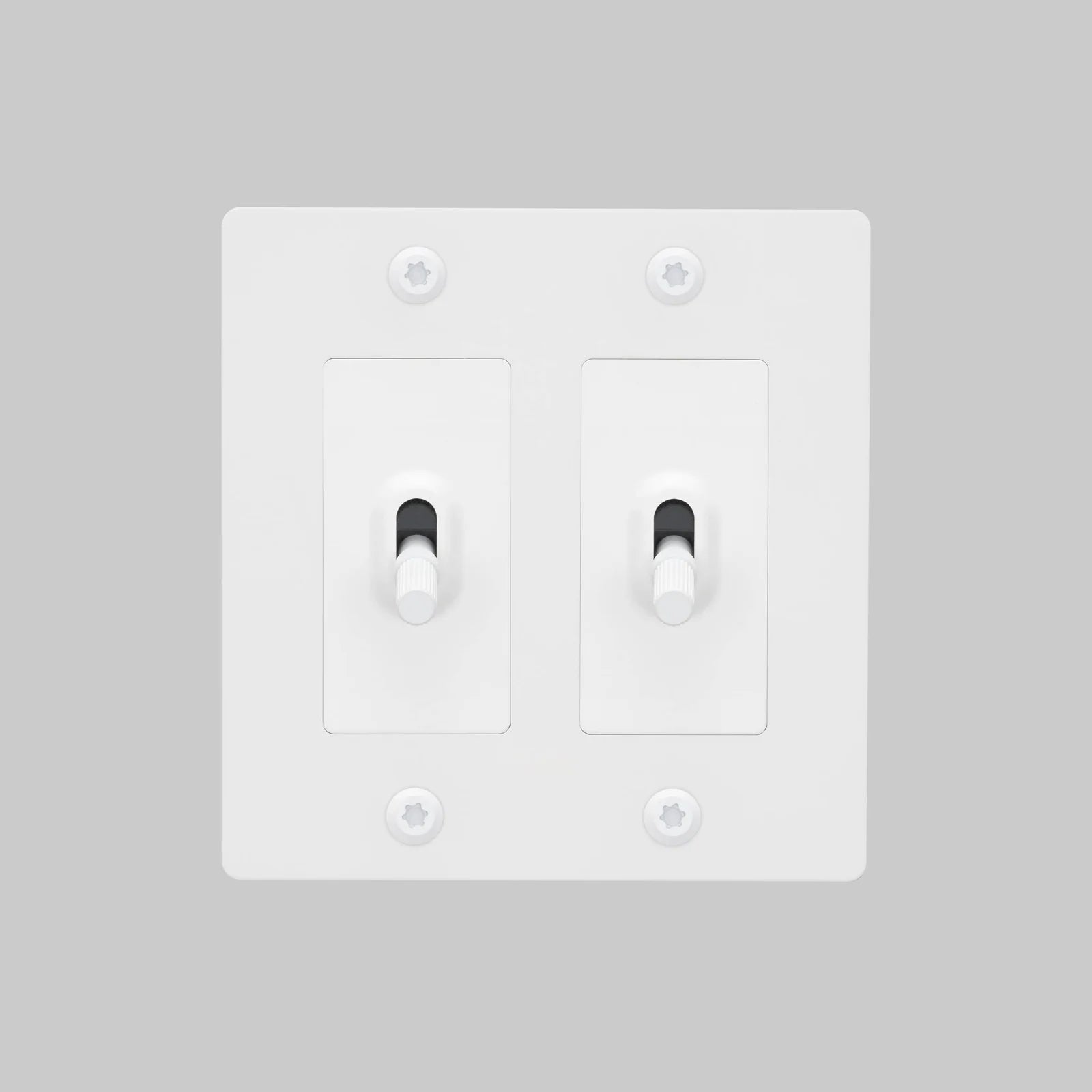 - Configuration: 2-gang plate with two individual on/off toggle modules